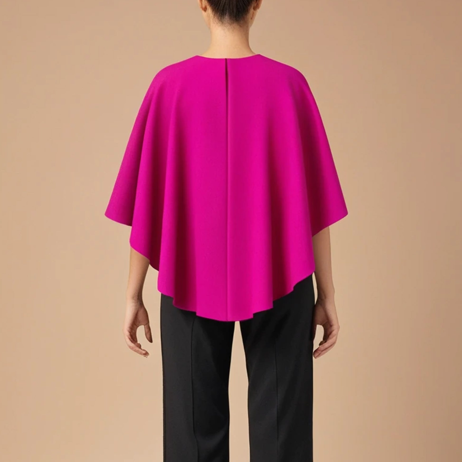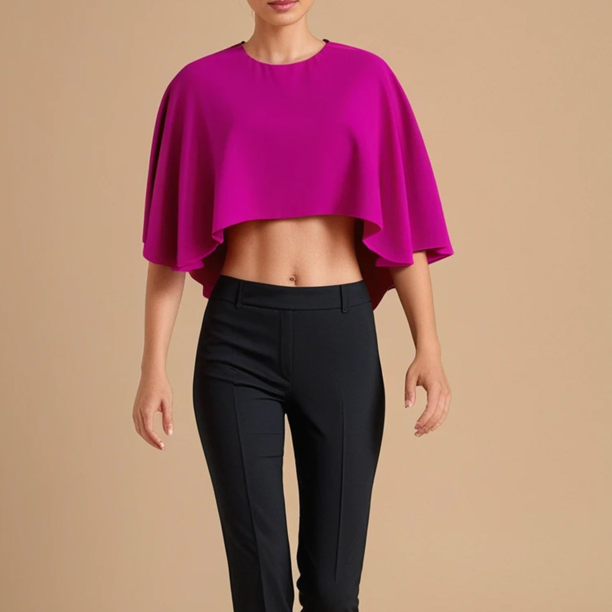 This dramatic cape-style crop top blends fluidity with bold structure, offering a statement silhouette for modern dressing. Designed with a high round neckline and oversized drape, the top features wide-flowing panels that fall gracefully over the shoulders and arms, creating a cape-like effect. The front hem is cropped high to reveal the midriff, while the back extends longer for added dimension and coverage. Its construction eliminates traditional sleeves, allowing for unrestricted movement and a lightweight feel. Ideal for layering over fitted bottoms or high-waisted pieces, this top makes a striking addition to both contemporary and occasion wardrobes.